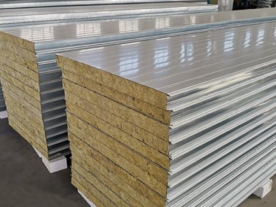 巖棉彩鋼夾芯板其上下表面采用鍍鋅彩色鋼板或鍍鋁鋅彩色鋼板,厚度為0.4-0.8mm。通過自動化連續成型機,經壓型后用高強粘合劑粘合而成。巖棉塊交錯鋪設,其纖維走向垂直于巖棉彩鋼夾芯板的上下表面,并緊密相接充實了巖棉彩鋼瓦的整個縱橫截面。巖棉塊之間和域名與上、下層鋼板之間通過高強度發泡劑粘接復合而成。巖棉彩鋼瓦有很強的剛度,具有防火、保溫、隔音等性能。
